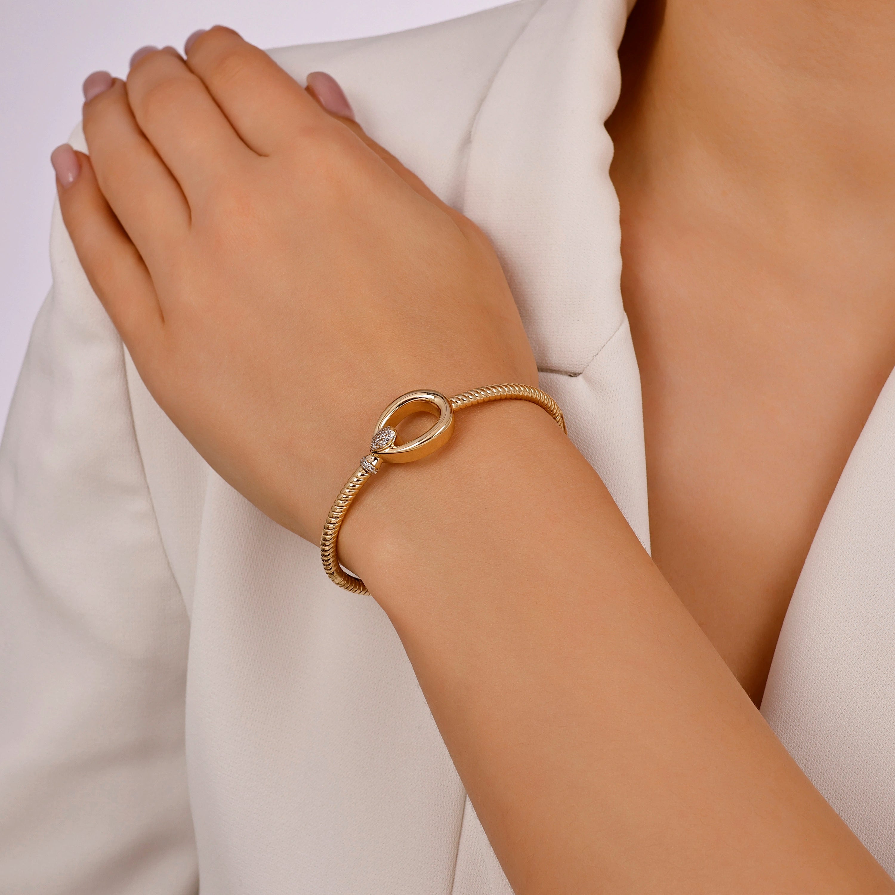 Bu altın tasarım kelepçe 14 ayar altından üretilmiş olup 8.12 gram ağırlığındadır ve yaklaşık 6 cm çap ölçüsüne sahiptir. Hafif ve dengeli yapısı sayesinde bilekte konforlu bir kullanım sunar. Altın kelepçe bilezik kategorisinde yer alan ürün, minimal tasarımıyla günlük kullanıma uygun olduğu gibi özel günlerde de şıklığı tamamlayan zarif bir tamamlayıcıdır. Belirtilen ürün gramajı, üretim sürecine bağlı olarak ± %5 oranında değişiklik gösterebilir.