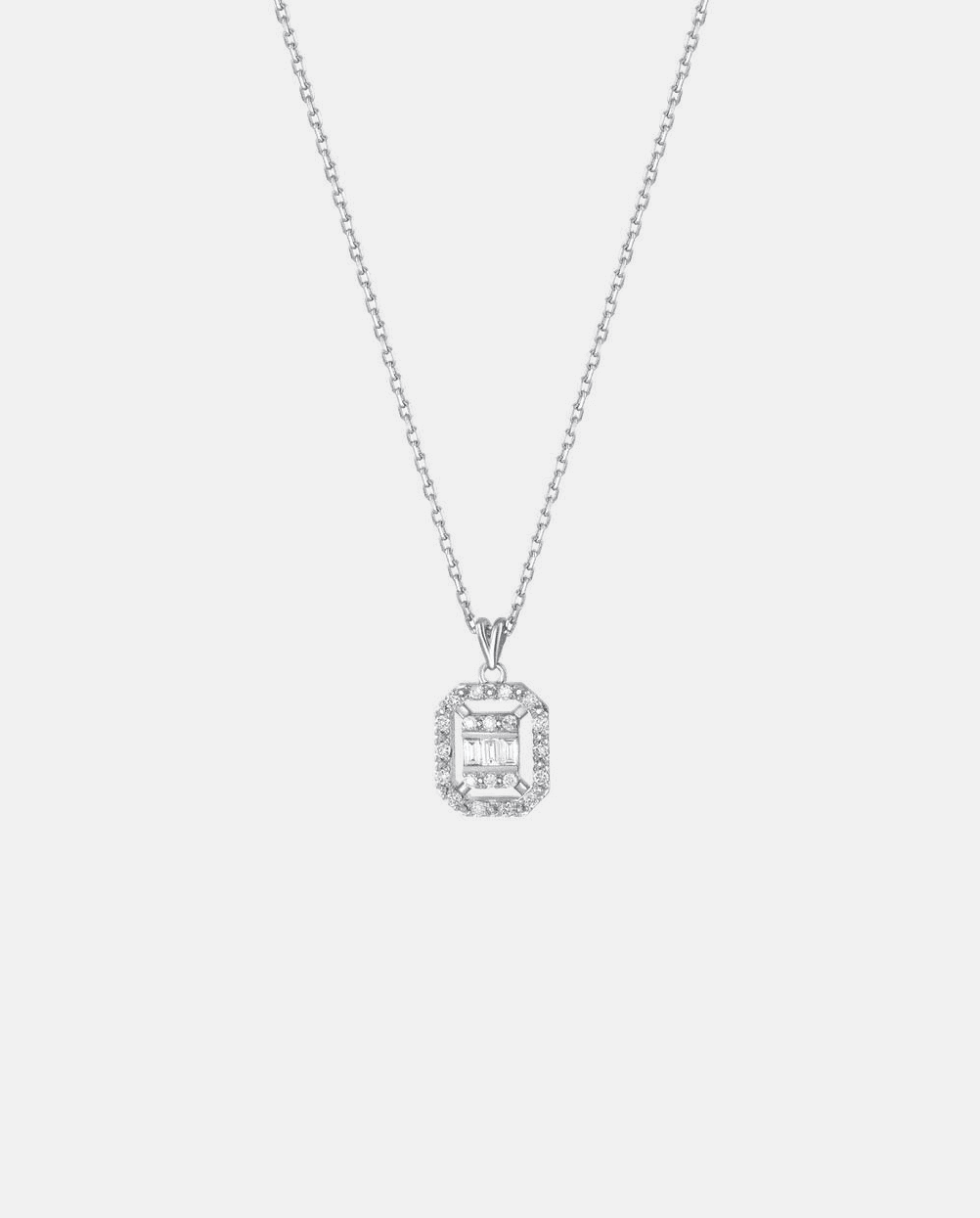 Assos Pırlanta'nın zarafet anlayışını yansıtan bu kolye, 0.10 karat F renk ve SI berraklıkta baget kesim pırlantalarla tasarlanmıştır. 8 ayar beyaz altın zemin üzerine özenle yerleştirilen taşlar, şıklığınıza ışıltılı bir dokunuş katar. Minimalist çizgilere sahip bu kolye, hem gündelik hem özel anlar için ideal bir aksesuar sunar.